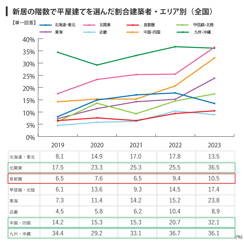 リクルート2023年注文住宅動向・トレンド調査によると、注文住宅建築者の中で平屋を建築した方の割合は2019年11.3%から2023年20.6%と大幅に上昇しています。建築者の5人に1人が平屋を建てている事になります。その中でも「北関東」、「四国・中国」、「九州・沖縄」エリアでは、30%を超えており3人に1人前後の方が平屋を選んでいます。