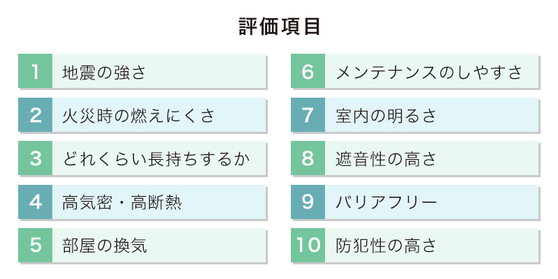 評価項目は、全部で10項目あります。わかりやすい言葉でいうと、①地震の強さ、②火災時の燃えにくさ、③どれくらい長持ちするか、④高気密・高断熱、⑤部屋の換気、⑥メンテナンスのしやすさ、➆室内の明るさ、➇遮音性の高さ、⑨バリアフリー、⑩防犯性の高さ、以上の10項目です。