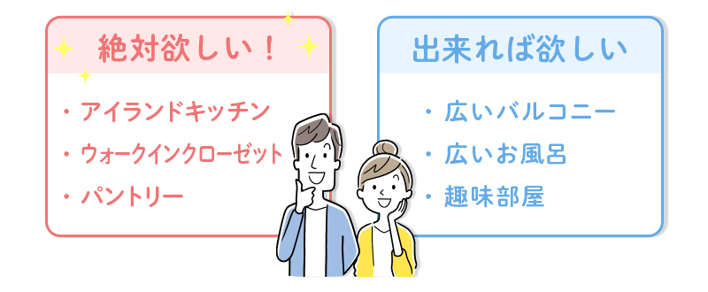 優先順位とは言っても、100個ある要望に1番~100番まで順番をつけるのは大変ですし、その必要もありません。そこでお勧めしたいのは、「絶対に叶えたいこと」と「できれば叶えたいこと」の2つのグループに分けてみることです。