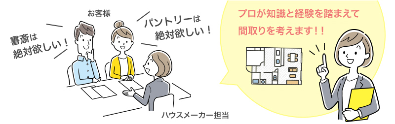 でも、実際に自分たちの生活を反映した間取りを考えてくれるのは、ハウスメーカーの設計者等の専門家です。膨大な専門知識が必要な家づくりにおいて、専門家の知恵と経験を使わない手はありません。