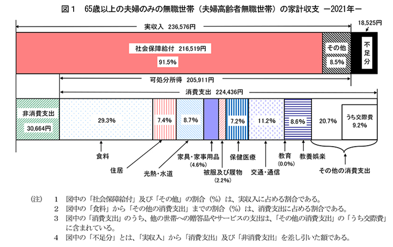 総務省による2021年時点の統計によると、65歳以上の夫婦のみの無職世帯では、毎月18,525円の生活費が不足していることが分かります。