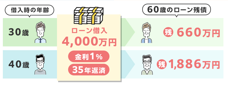 参考までに30歳の方、40歳の方が金利1%で35年返済、4000万円を借りた際の60歳のローン残債はそれぞれ660万円、1886万円となり、その差はなんと1226万円です。