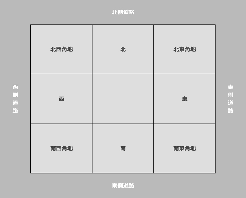 例えば、下図のように東、西、南、北、4つの方角に道路がある9つの土地があったとします。どこが一番高くなると思いますか?