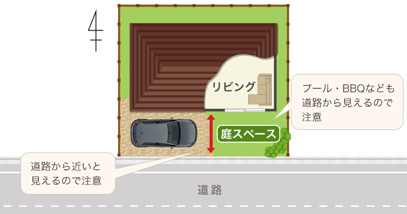 一方、デメリットもあります。日当たりを得るために、南側に大きな窓をつけた場合、道路からの距離がある程度確保出来ないと視線が気になります。せっかくの明るいリビングなのに室内が見られているようでいつもカーテンを閉めるという本末転倒にもなりかねません。また子育て世代に人気の庭でプールやバーベキューも道路に近くなりますので検討が必要です。