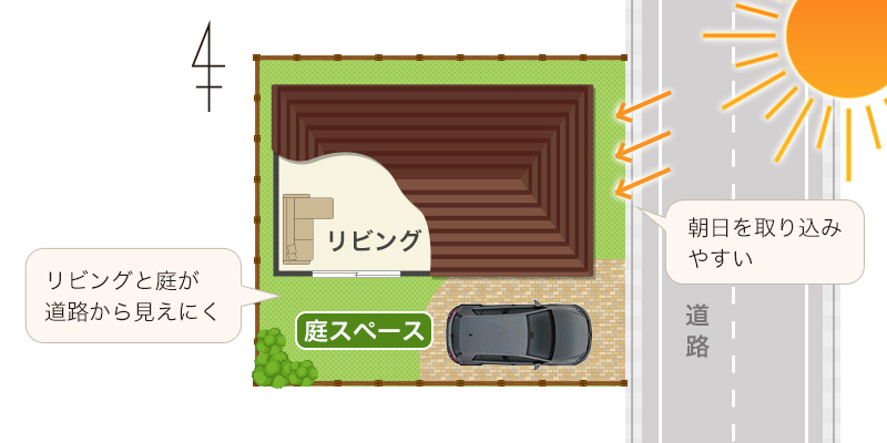 東道路のメリットは、東側が開けているので朝の光が入り、午前中の日当たりがいいですね。間取りとして、道路側に玄関を配置し、南向きにLDKを取ることができます。このプランならLDKは道路に向いていないので、道路側からのプライバシーは確保できます。また南道路より土地代は安くなります。