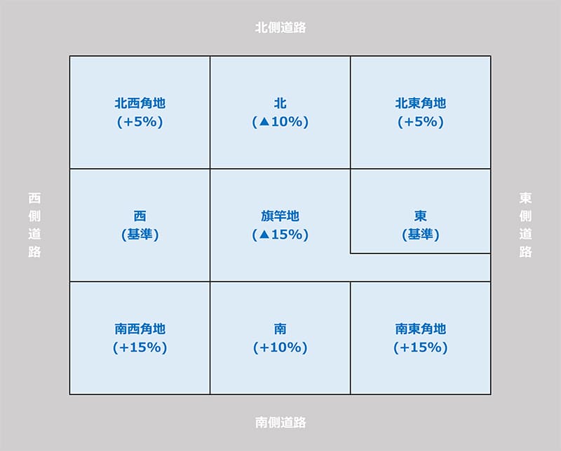 道路が同じ幅なら、道路の向きによって価格が変わる