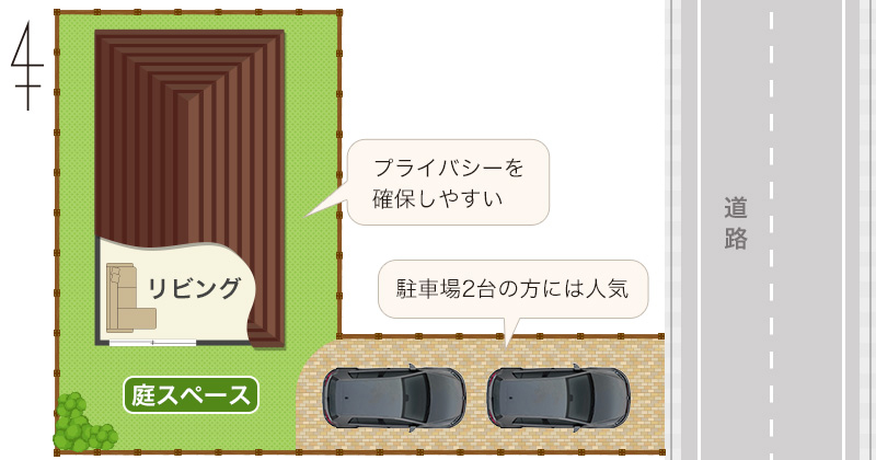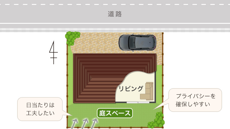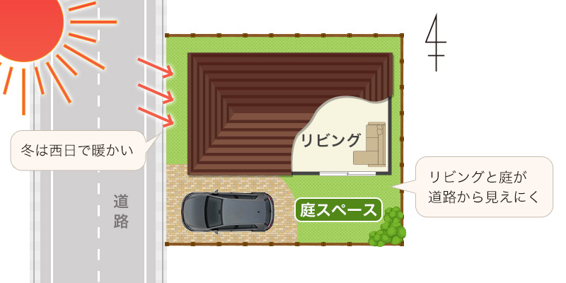西道路は、プライバシーについては東道路と同じ。南側に配置したLDKのプライバシーが確保しやすくなります。午前中の日当たりは望めませんが、午後からの日当たりは見込めます。夏場の西日はジリジリ差し込むというのはデメリットですが、冬場は暖かく過ごせるのはメリットです。