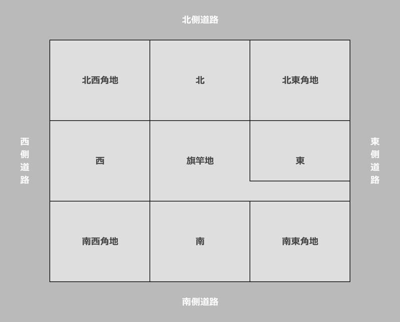 図では角地があります。角地は開放感もあり価値が上がるので9つの区画で最も価格が高いのは南東角地、その次が南西角地、そして南の順番となっていきます。