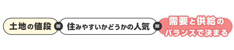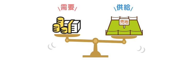 土地の価格は定価がありません。『需要と供給』のバランスによって価格が決まります。大変割り切った言い方をすれば、多くの人が「いい」と思うエリアの土地は高く、逆の場合は安くなります。