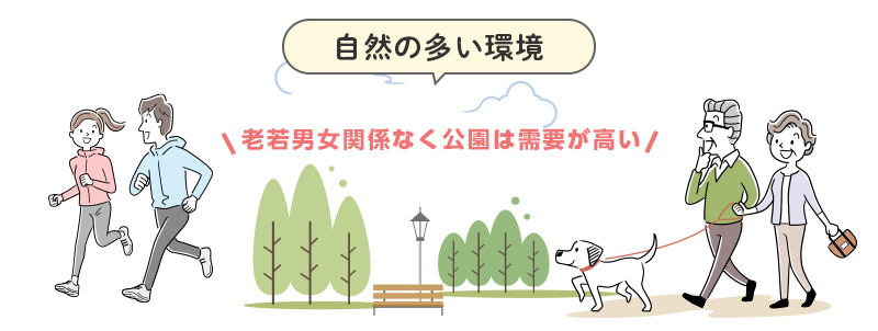 近くに大きな公園があったり、身近に自然や緑を感じることができる環境は人気があります。子供が安全に遊べる場所として、健康維持やスポーツを楽しむ場所としてだけでなく、四季の移ろいや自然の木々や植物を身近に目にすることができる環境は魅力です。近年ではランニングコースや整備された川沿い、海近隣なども自然要素として散歩、ランニングなどに人気です。