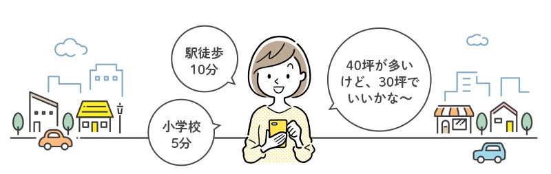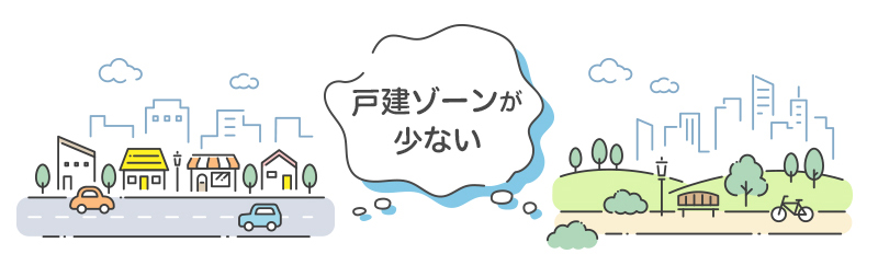 例えば、広いエリアで探しているつもりでも、そのエリアのほとんどがマンションや大型団地、公園等で占められている場合、戸建て用地はほんの数えられるほどしかないということがあります。そうしたエリアでは、当然、戸建ての土地を探そうとしても、なかなか物件が出てきません。