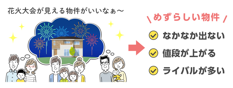 自宅からキレイに山が見える、海が見える、花火大会が見える等は多くの方の理想ではないでしょうか。でも日常生活+αの魅力のある土地は、お寿司のネタで言えば大トロのようなもの。希少部位なので滅多に物件は出てきません。「どうしても」ということなら、費用も去ることながら物件が出てくるまでじっくり待つくらいの覚悟が必要かもしれません。