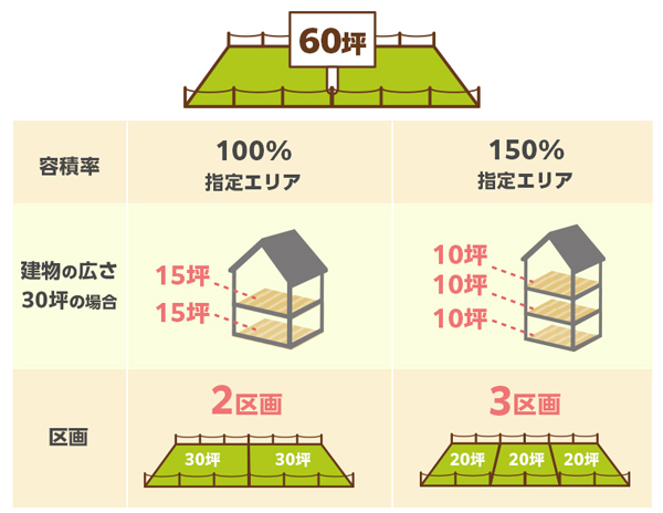 例えば60坪の土地があったと仮定します。容積率が100%に指定されたエリアでは、30坪の広さの建物を建てるには30坪の広さの土地が必要ですので、多くの人の需要に応えて30坪×2区画に分割されます。そのため、このエリアで20坪の土地を探そうとしてもなかなか物件は出てきません。