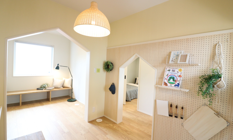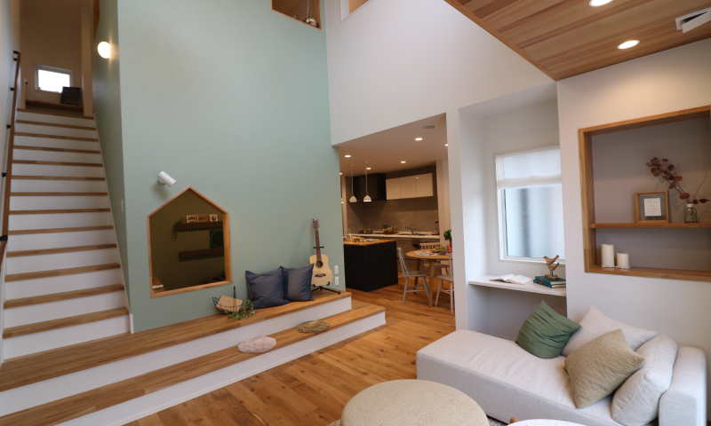 吹抜けとオウチタワーを中心に広がる、タテにもヨコにもつながる憩いの場。吹き抜けと2階ホールの間に、壁に囲まれたオウチタワーを配置することで、個々の暮らしのスタイルを豊かに彩る「nana-cara(ナナ・カラ)」です。