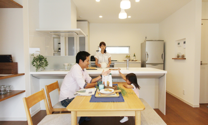 子育てママの「欲しい!」がギュッとつまった家「フェリーチェロ」、キッチンからは家じゅうが見渡せる、買い物から帰るとキッチンまでの動線がスムーズ、家中にたっぷりの収納、家事が楽な水回りのつながり、細やかな「欲しい!」がつまっています。
