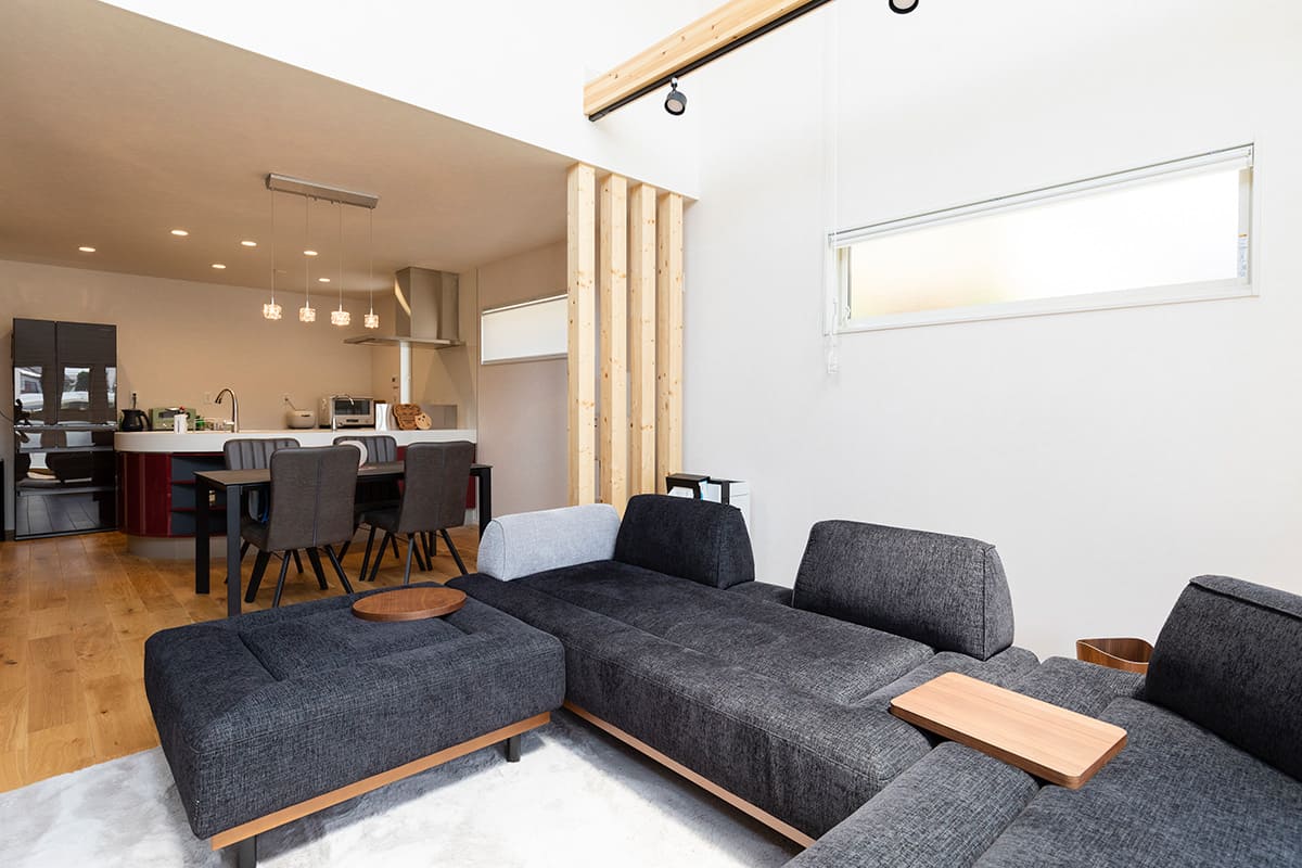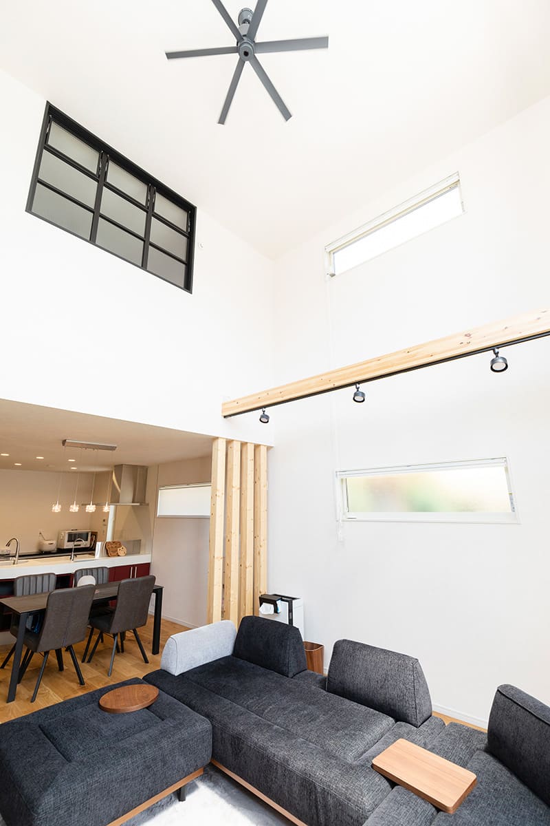 5mを超える高さのシーリングファン付きの吹き抜け。10畳ある広いリビングをより広く演出。