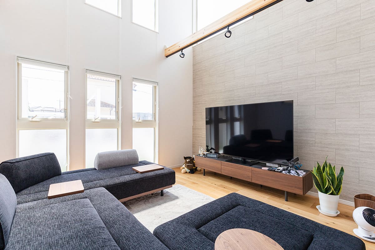 三方向に窓を設け明るさを重視した梁型のアクセントで変化を付けたリビング。