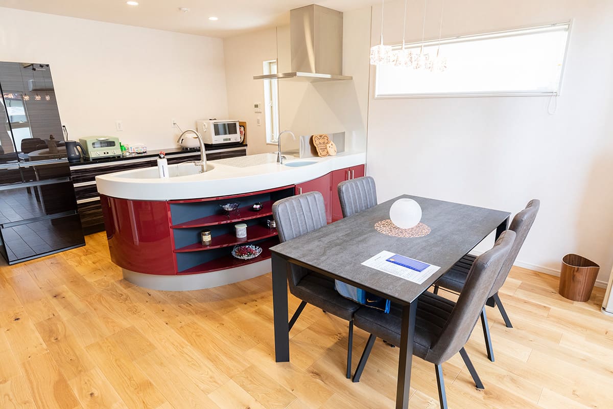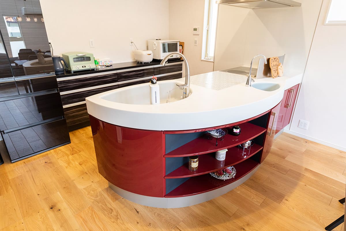 インテリアの一部にもなる曲線が目を引くフラット対面キッチン。