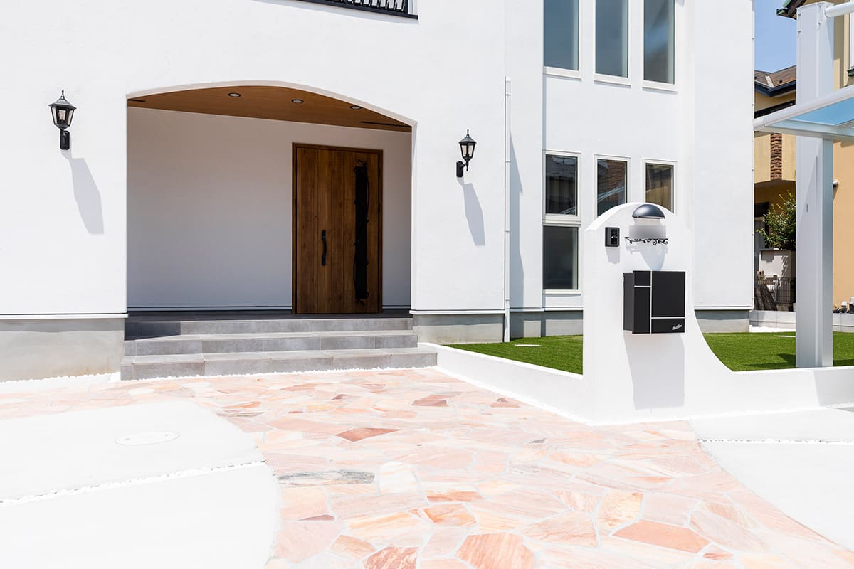Rの曲線とピンクの乱張りアプローチが目を引くエントランスはご主人の一番のこだわり空間。