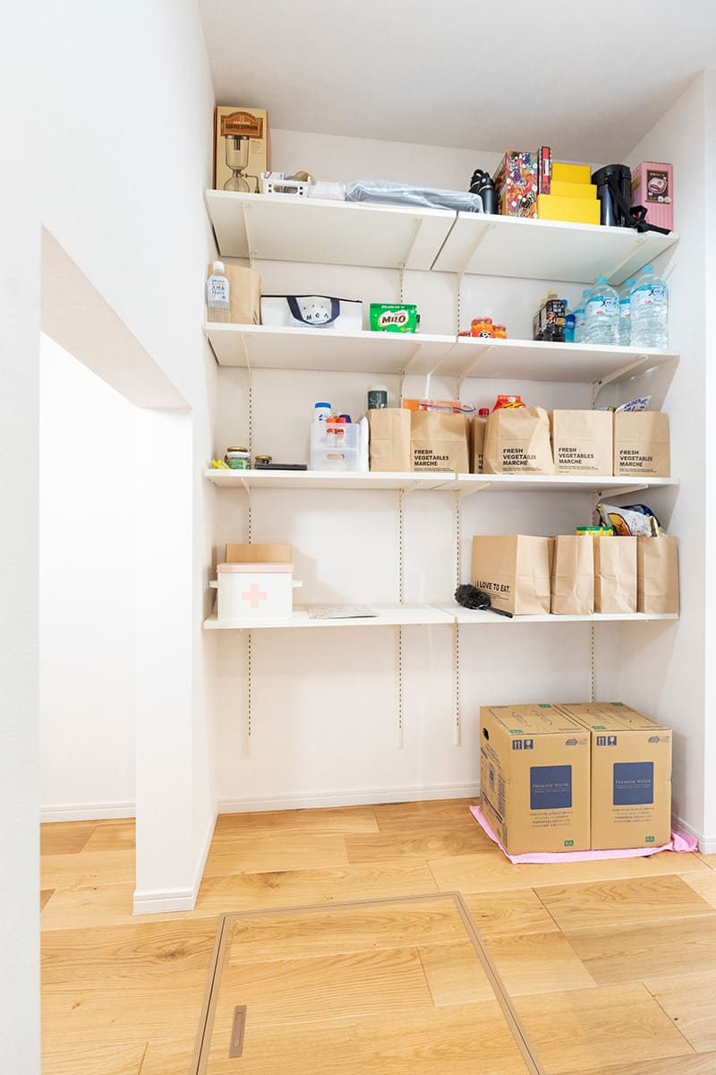 キッチン横の大型パントリー。階段下の空間も利用し、大容量を実現。