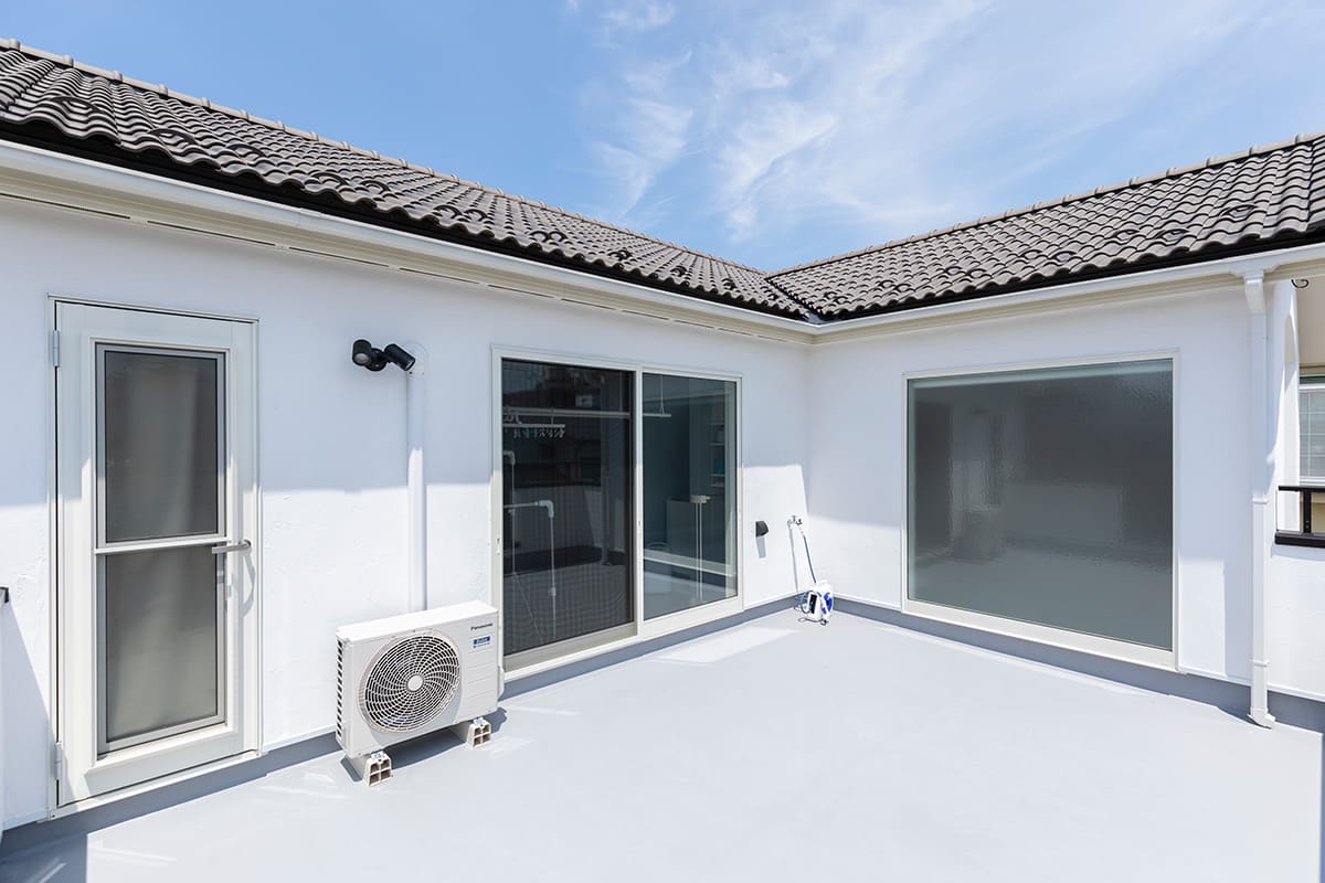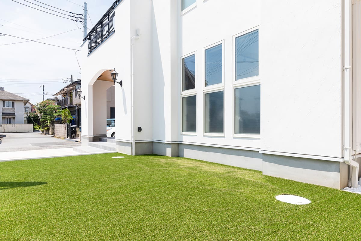 メンテナンスのしやすい人工芝を採用し白亜の外壁と美しいコントラストをなす庭。