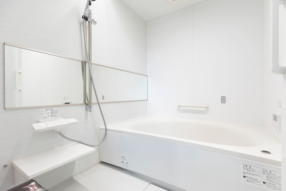 白色に統一され、視覚的な明るさと大型のシステムバスでゆったりとくつろげる浴室。