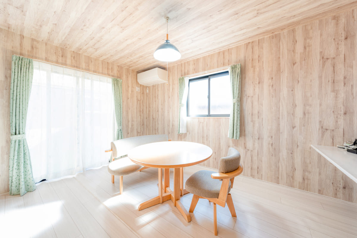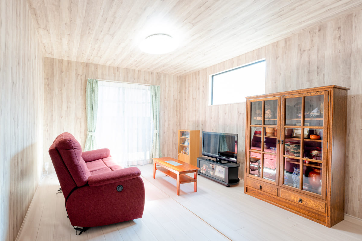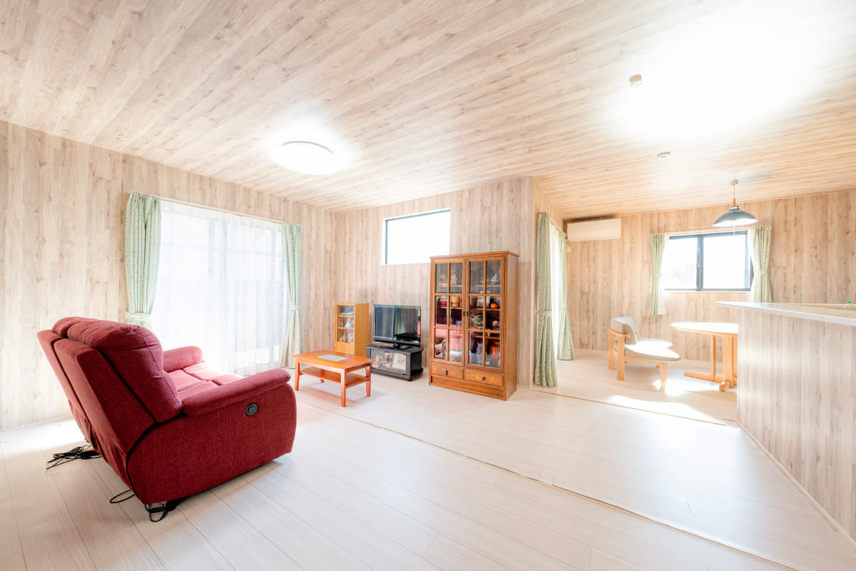 壁面と天井クロスを明るい木目調の同色にし、ゆとりの生活空間を演出