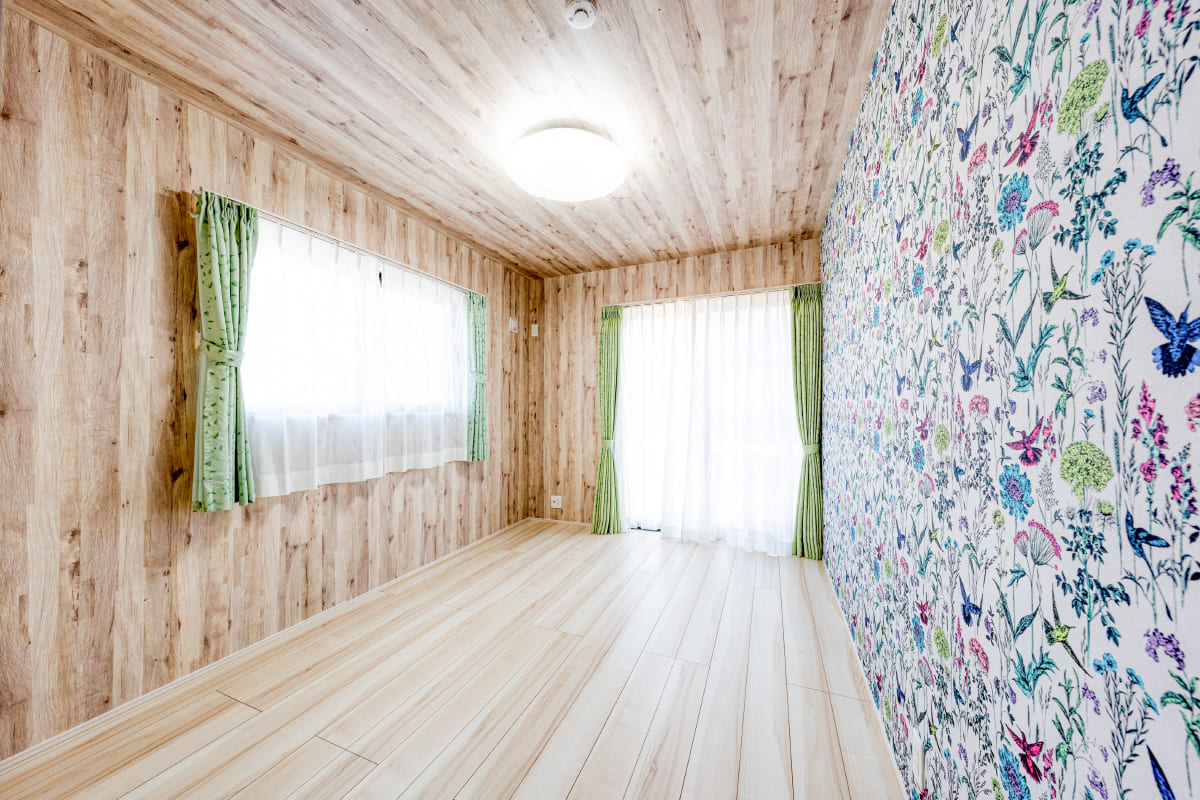 明るい木目調の壁紙でまとめながら1面のみ 美しいテキスタイルの壁紙を採用した洋室。