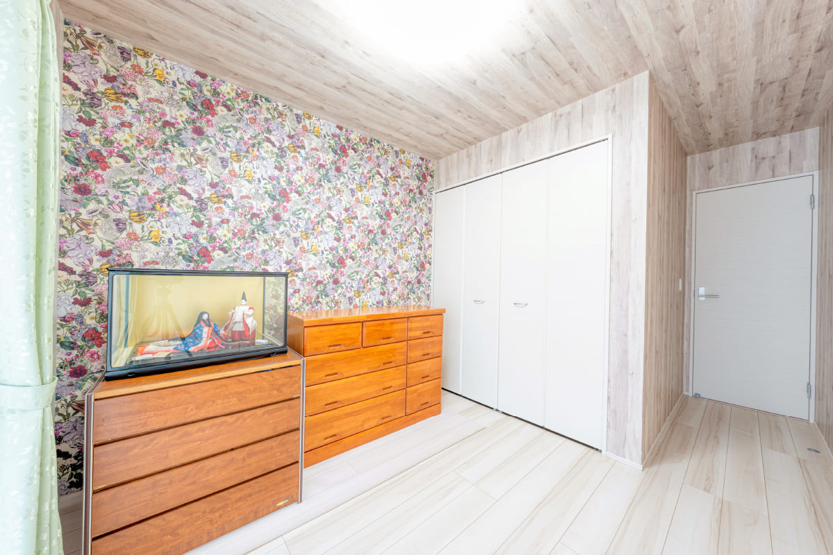 奥様が利用される女性らしい壁紙を配置した洋室。 大型のクローゼットですっきりと収納。