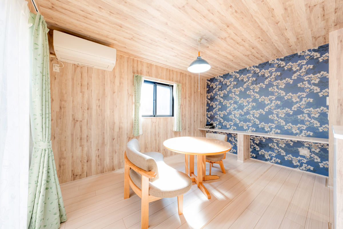 木目クロスをベースにしつつ遊び心のある1面張りで個性的な空間演出