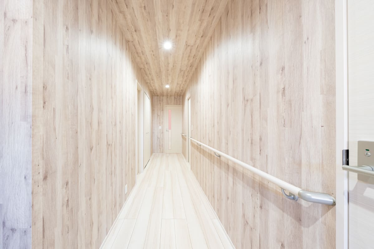 車いす対応も可能な幅広な廊下には 先々の利用を見越した手摺りを設置。