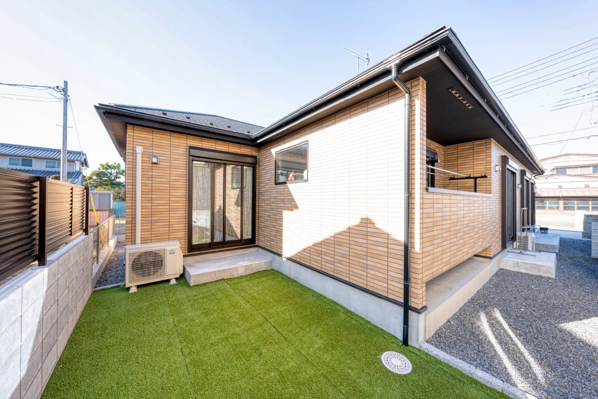 メンテナンスの楽な人工芝を敷き詰めた庭。 平屋ならではの空の大きな空間を創り出している。