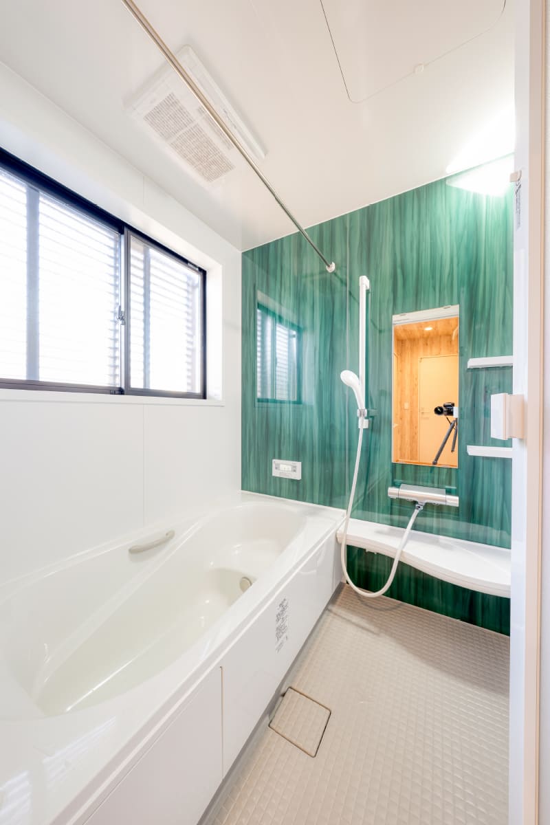 高級感のある壁材を採用し、大きな窓から明るい日差しが差し込む浴室。 彩光と通気性を確保。