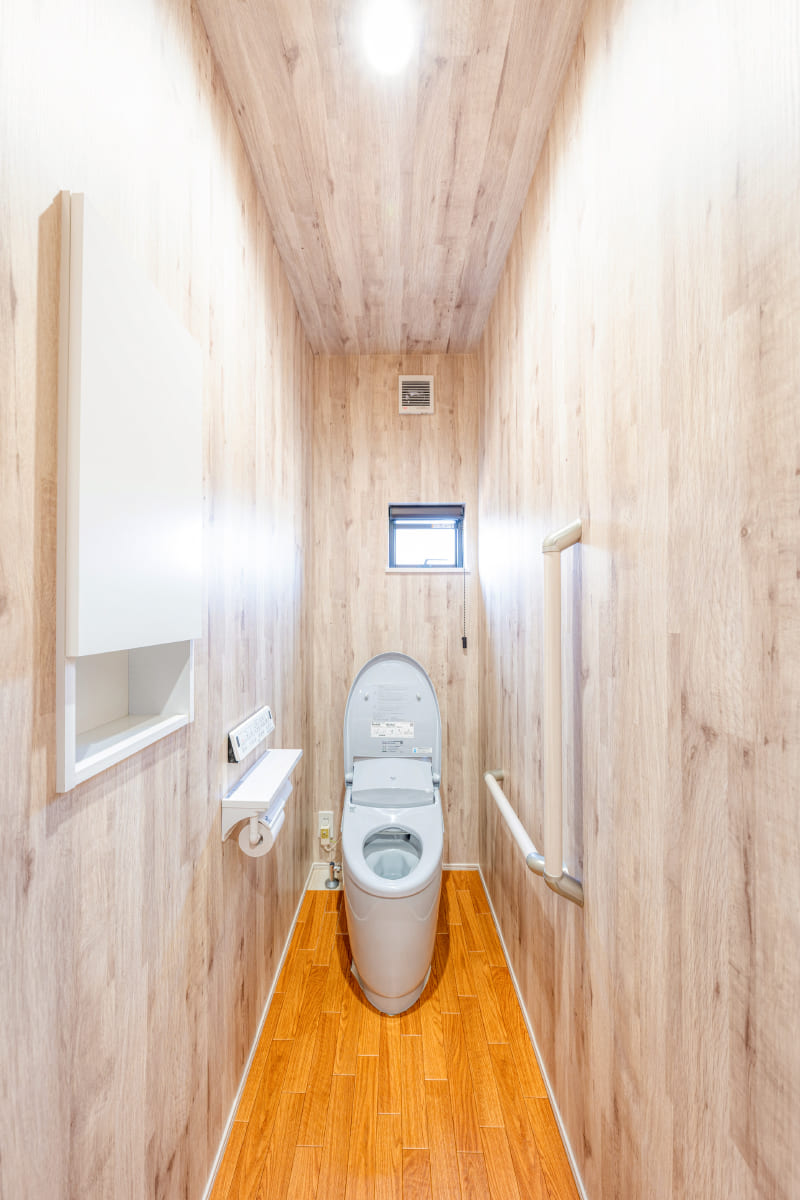 各部屋と同一の配色の壁紙と天井クロスを採用し シンプルにまとめられた機能的なトイレ。