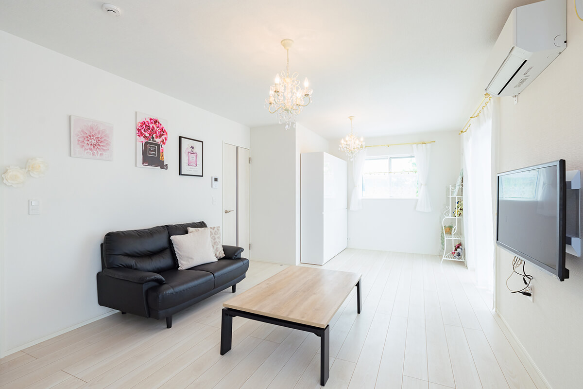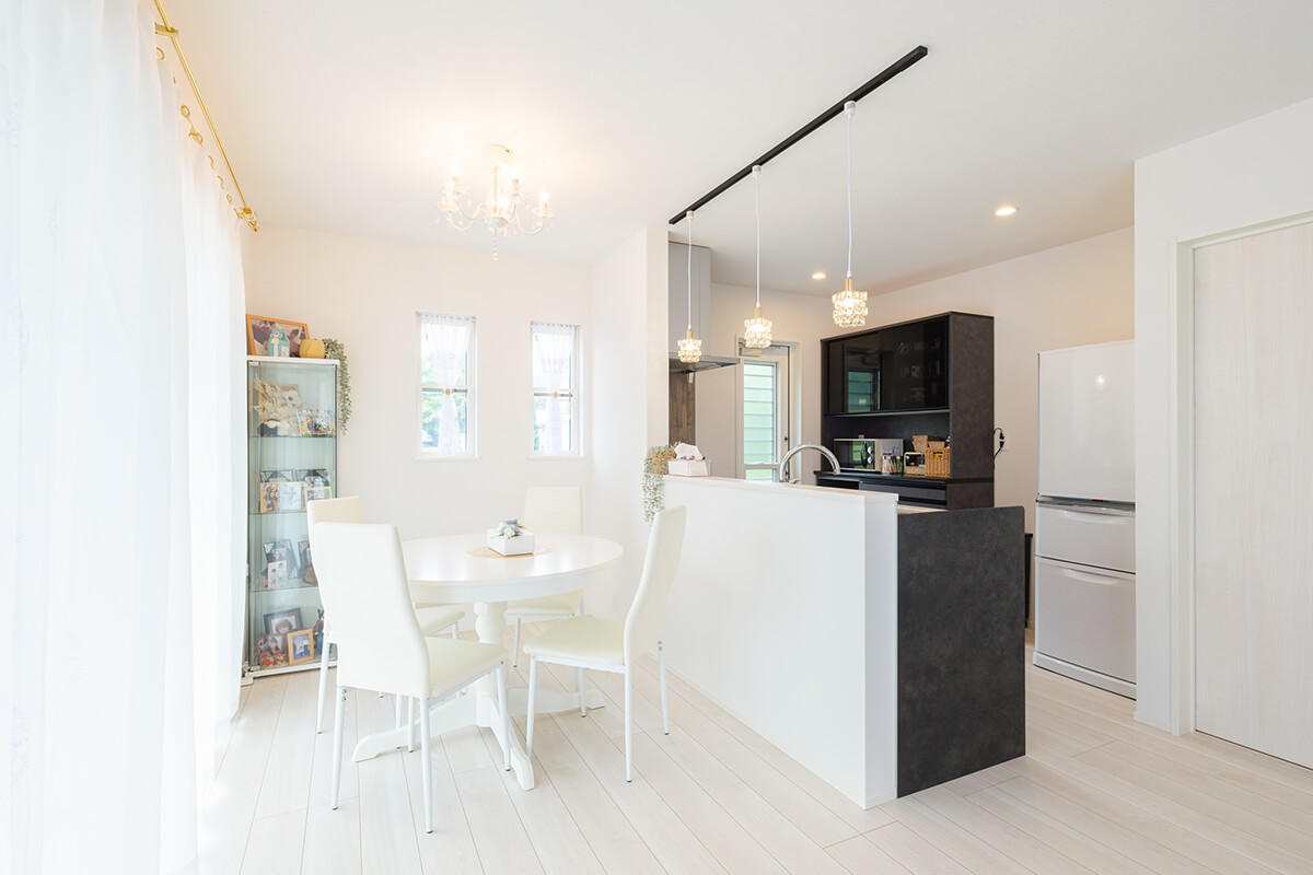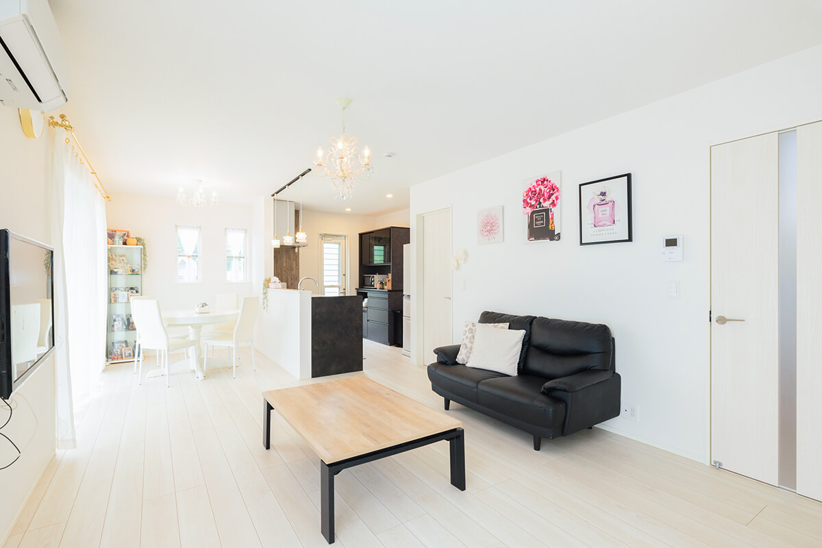1階は淡い色調でまとめられた広いリビングが特徴の親世帯