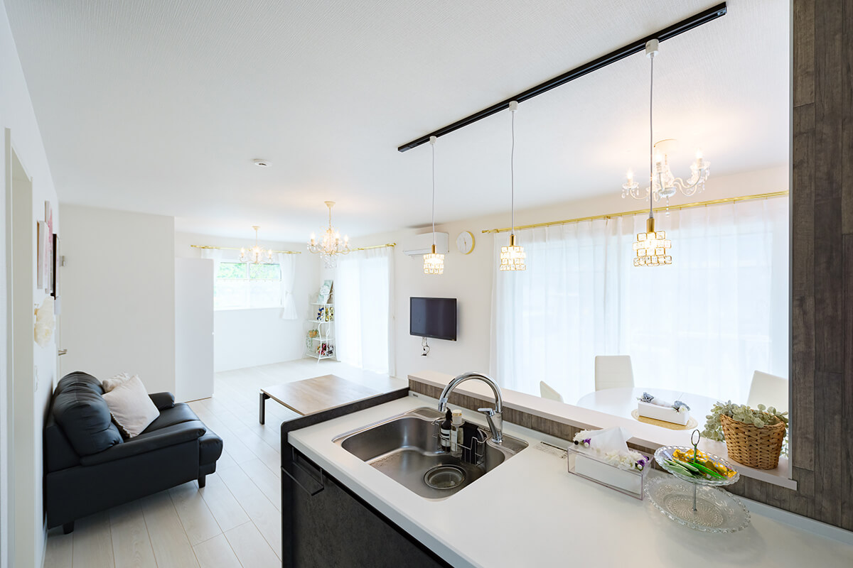 対面式のキッチンは、洗い物をしながら外が眺められる配置に。空間を程よく仕切る3つのペンダントライトが印象的。