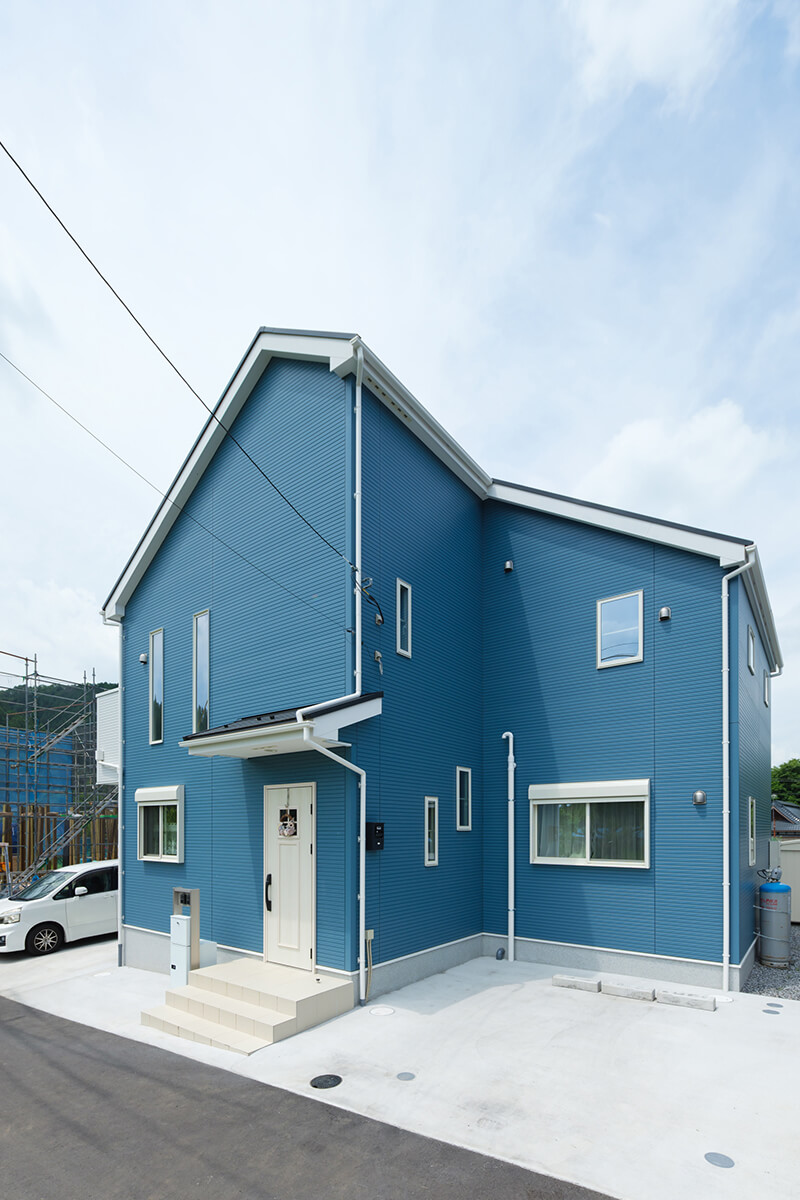 外壁はいろいろ悩んだ末に、鮮やかなブルーのサイディングを選択。共用である玄関とサッシは白を採用して、さわやかな印象の外観に。
