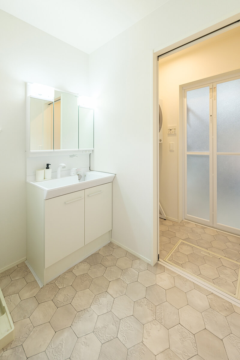 玄関と浴室は共用。洗面室とは別に脱衣室を確保して使いやすく