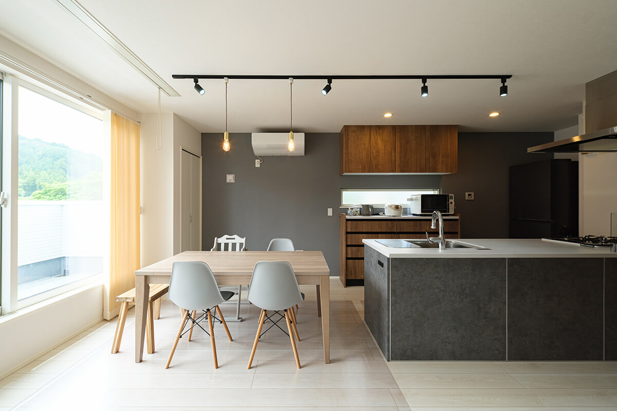 落ち着いたカラーを効果的に使った子世帯のダイニングキッチンは、ライティングレールを利用してシーンに合わせた照明演出を可能に。