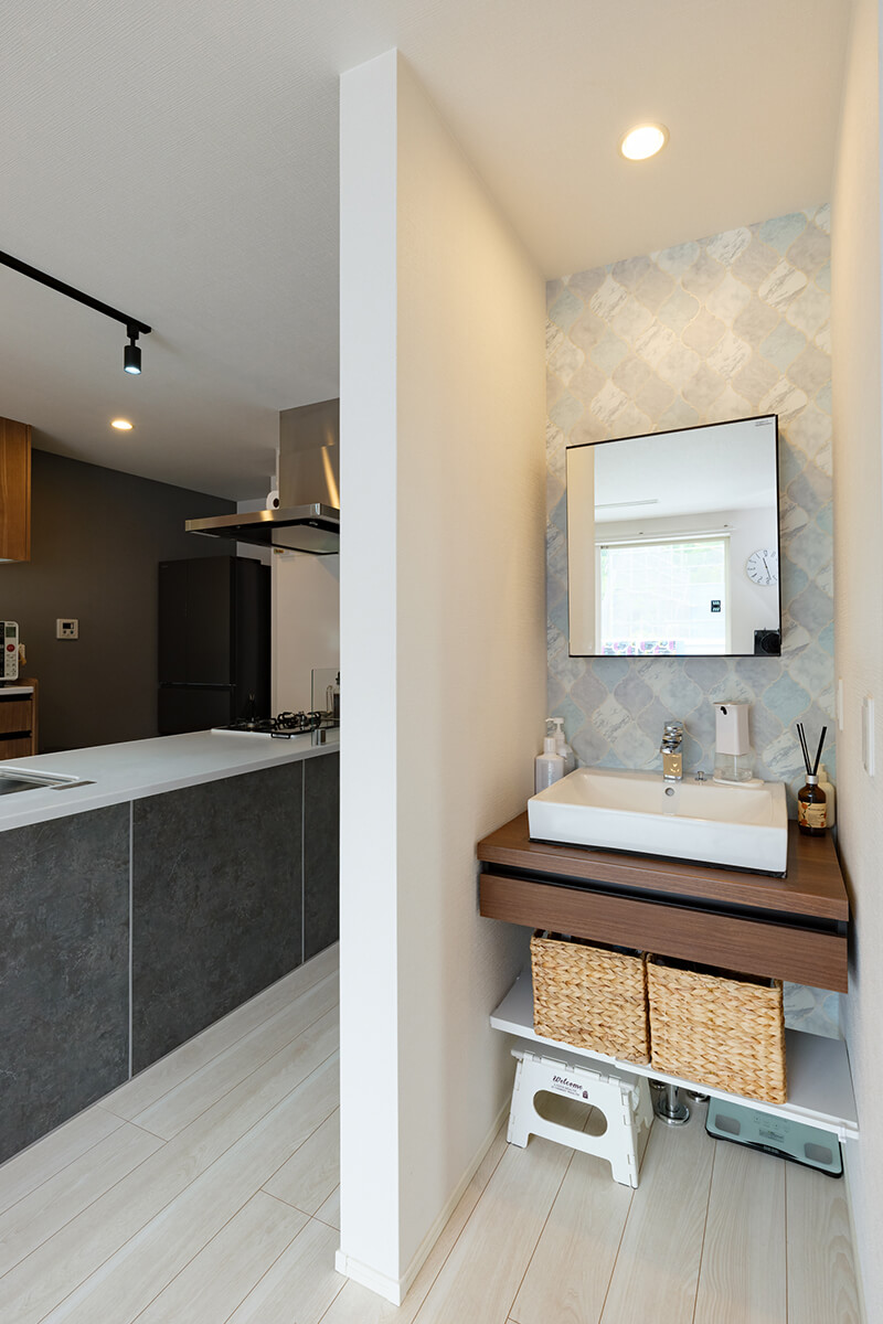 人の集まるオープン空間で、『見せる洗面』としてクロス選びにもこだわったデザイン性と実用性を兼ね備えた洗面化粧台。