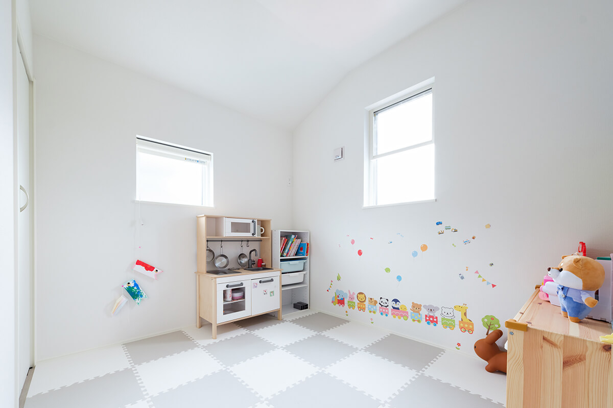 白を基調としたインテリアに、二面採光で4畳というサイズを感じさせない圧迫感の少ない明るい子ども部屋。