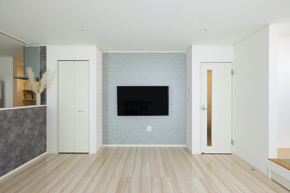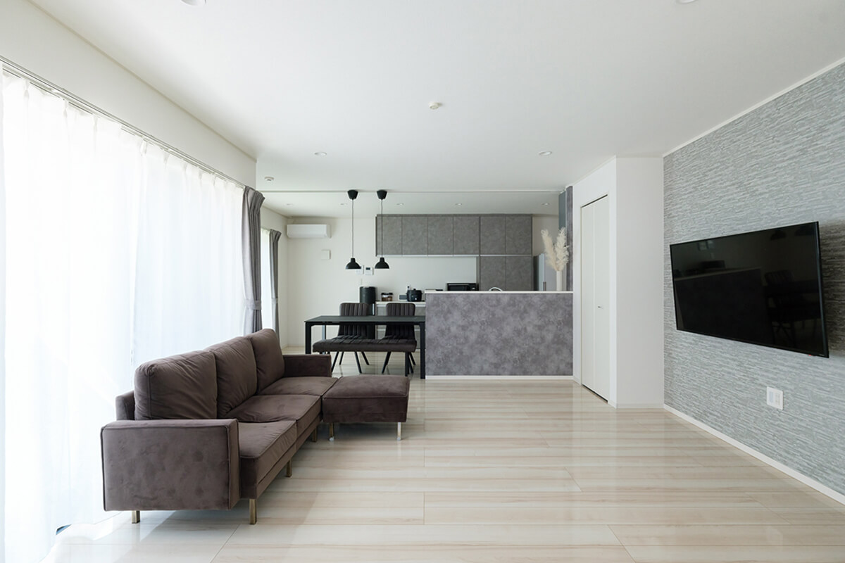 白、黒を基調にモノトーンでまとめることを意識したインテリア。選択に迷ったリビングのアクセントクロスは上品なグレーを取り入れて、全体と程よく調和。