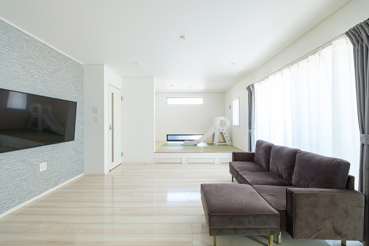 キッチンに立つと広々としたリビングを挟んで小上がりの和室。元気に遊ぶお子様の姿を見守れる安心設計。