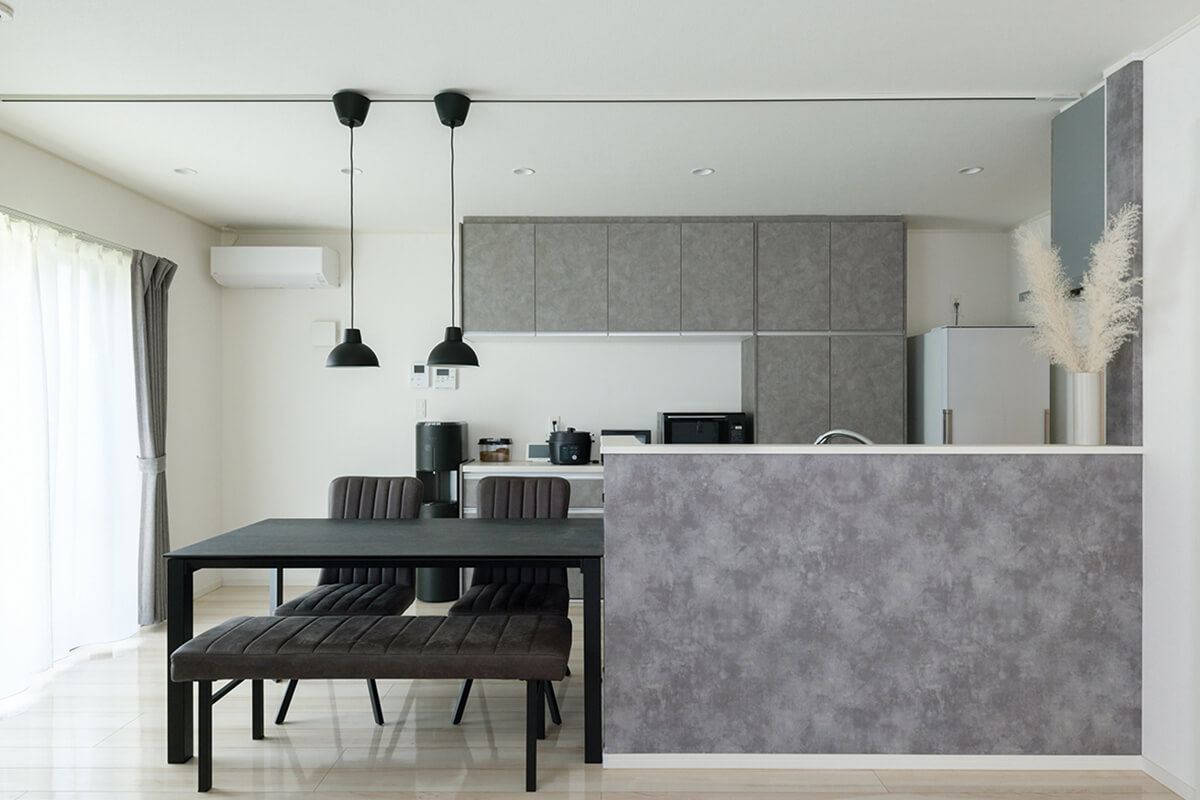 黒で統一された家具、家電が印象的なダイニングは、配膳や後片付けを重視してキッチンと横並びに。
