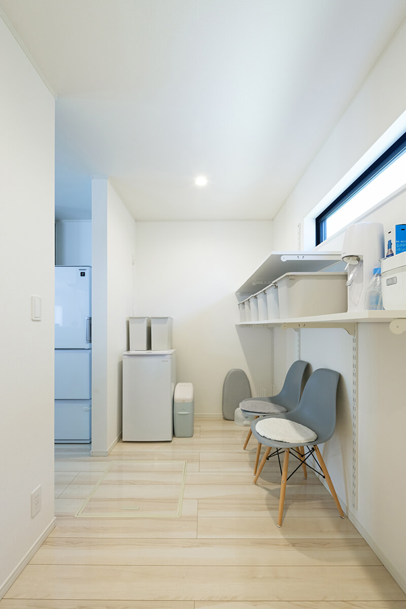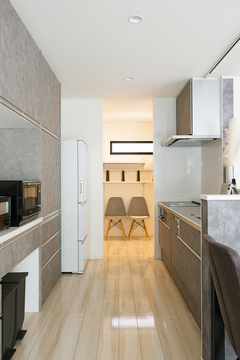 キッチンに隣接したパントリーは4畳とゆとりのある広さ。廊下側からも出入り可能で、買い物から帰ったらそのまま直行できる2wayの便利な動線。