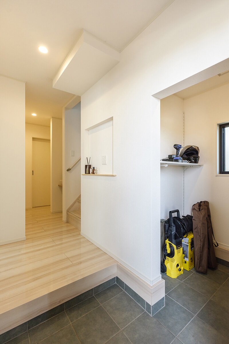 キャンプ道具などのアウトドア用品や洗車道具をまとめてしまうために、玄関横に収納スペースを確保。扉をつけなかったことで、コストダウンと共に物の出し入れが容易に。