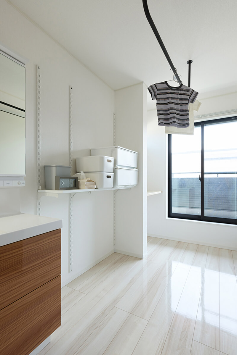 家事動線の中でも、とくにこだわった洗濯動線。洗濯機とバルコニーの動線を短くして、広めにとった洗面室は、収納棚も完備し、室内干しもできるようバーを設置。