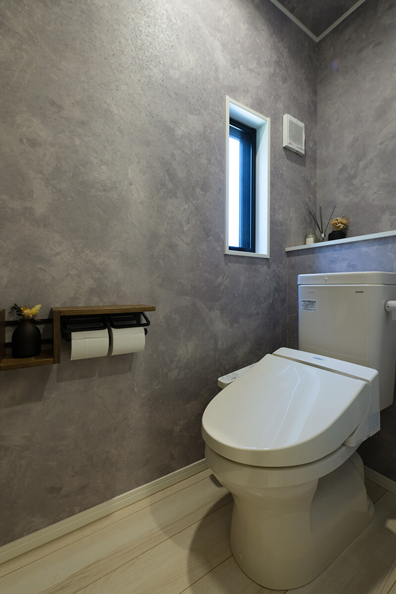 来客も利用する1階のトイレは、アクセントクロスを取り入れて、上質な雰囲気を演出。飾りを楽しむ事も考え、紙巻器は小物が置けるタイプを設置。