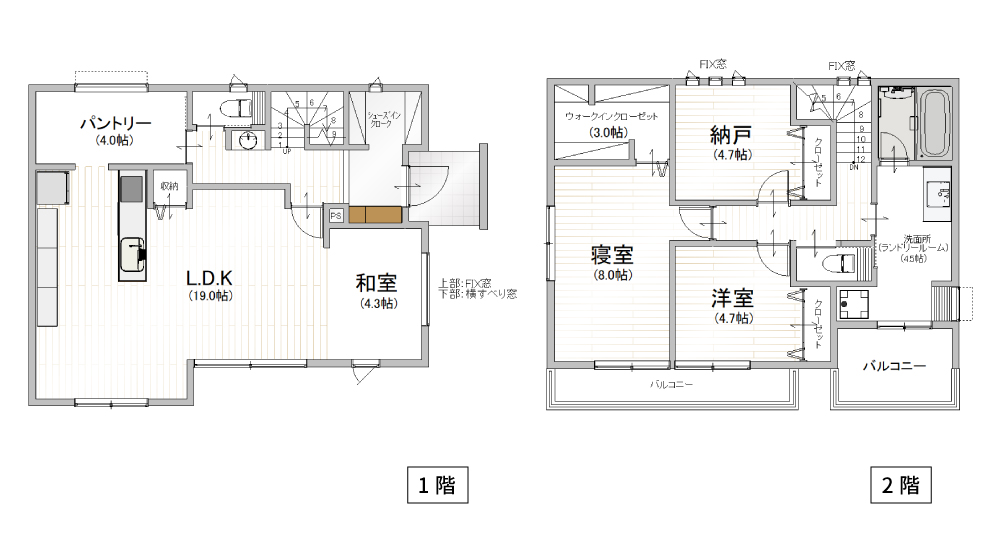 間取りは家事のしやすさを考え、効率的な動線を重視。キッチンとダイニングテーブルは横に並べ、調理中のお子様との会話、配膳もスムーズに出来る設計にしています。さらに、洗濯の一連の作業がしやすいように2階に設けた洗面室に洗濯機を配置して、直接バルコニーに出られる動線に。洗面室に収納を設けて、取り込んだ洗濯物をしまうことができるように工夫されています。