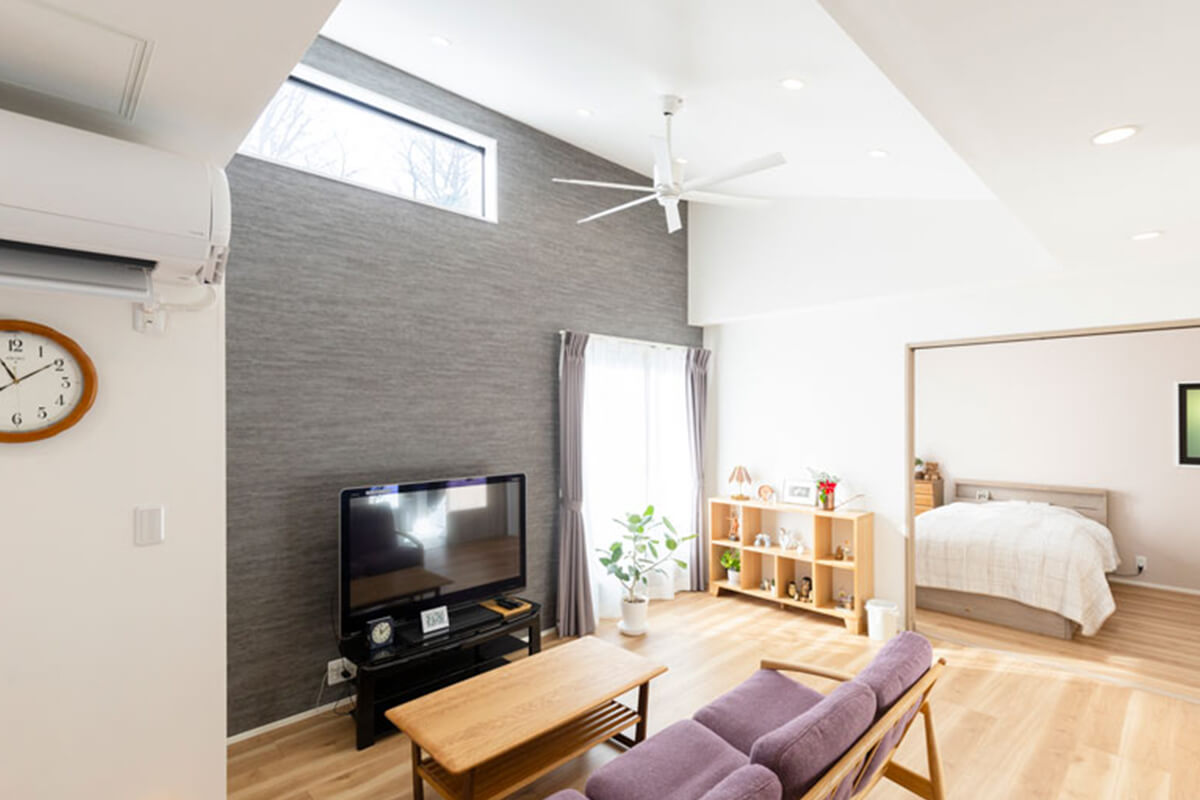 屋根勾配を利用した高天井と高窓で広々とした空間のリビング。アクセントクロス、シーリングファン、床暖房など開放的で居心地のよい空間に。